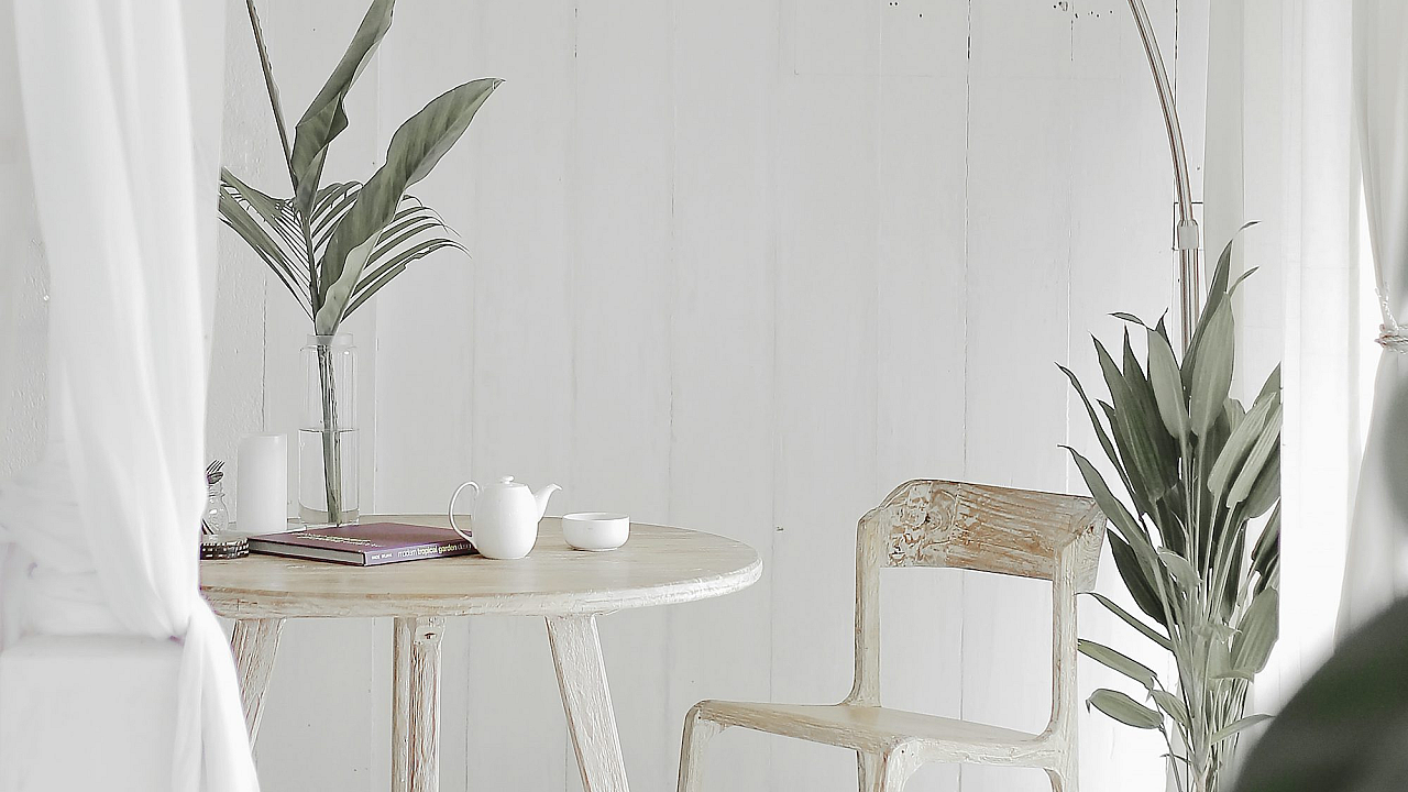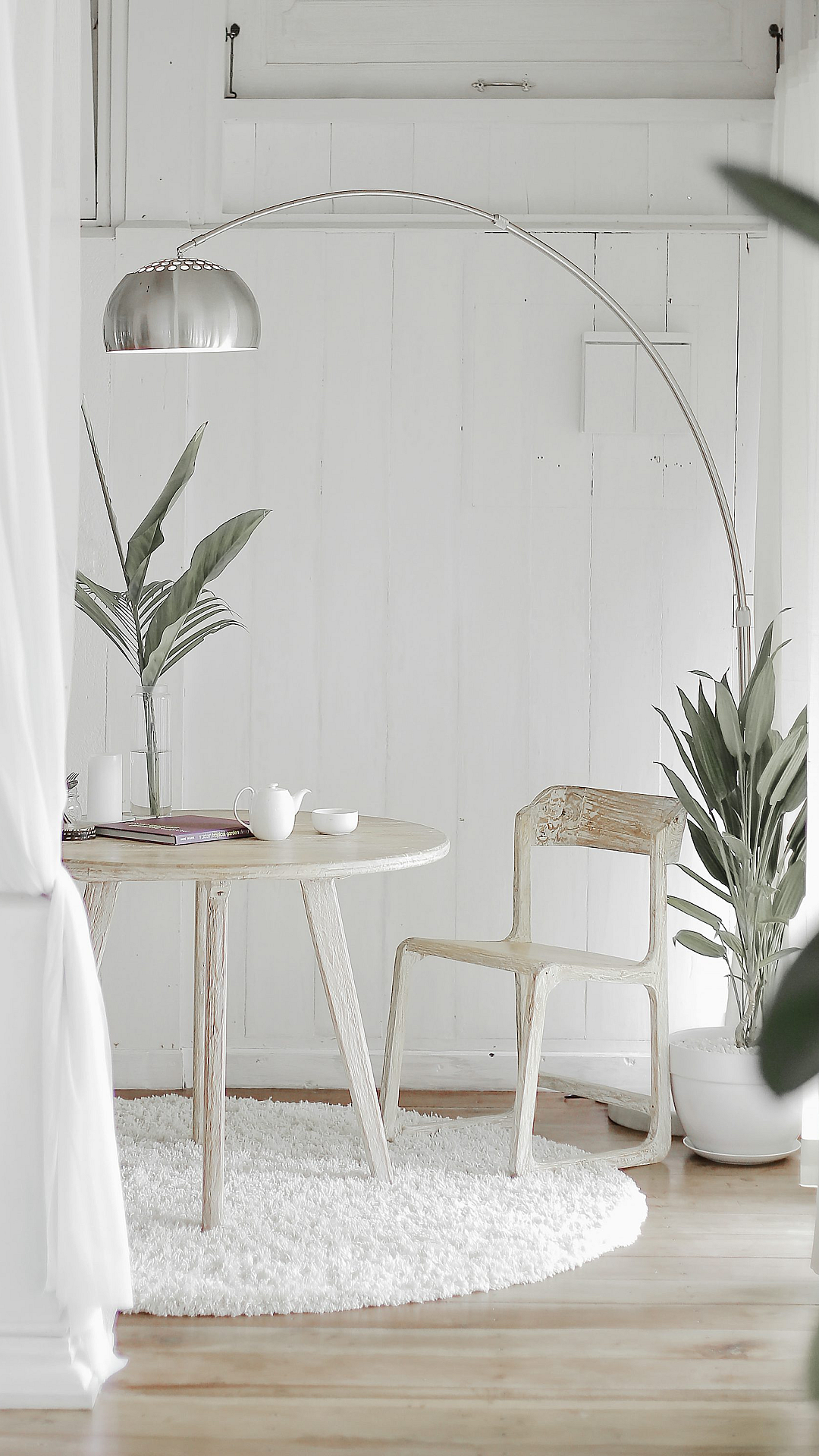 white steel chair, round table, white rug, minimalist wallpaper, modern wallpaper, simple wallpaper, interior design, furniture, home decor, clean aesthetic